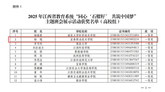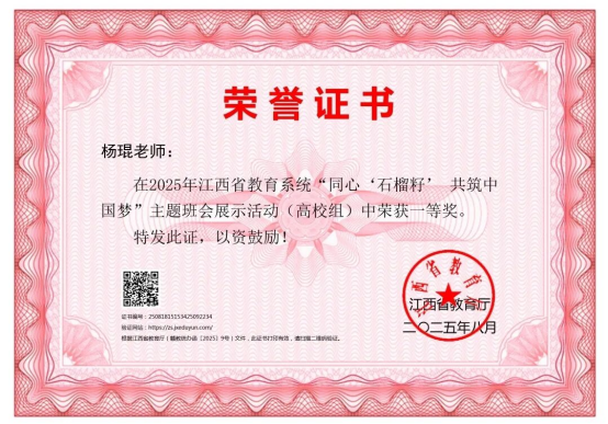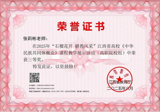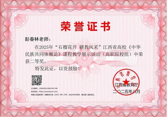 近日,江西省教育厅公布了2025年江西省教育系统“同心‘石榴籽’ 共筑中国梦”主题班会展示活动和2025年“石榴花开 赣教风采”江西省高校《中华民族共同体概论》课程教学展示活动的获奖名单,我校杨琨老师在主题班会展示(高校组)中斩获一等奖,彭春林老师和张莉彬老师在课程教学展示(高职院校组)中分别荣获二等奖和三等奖。