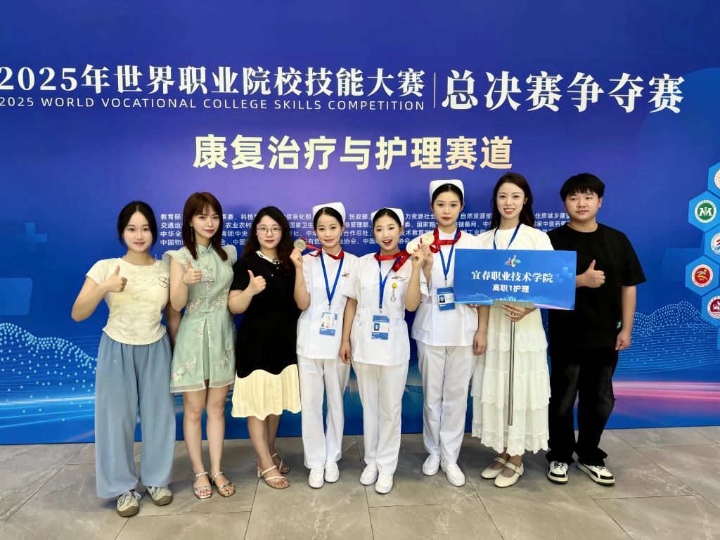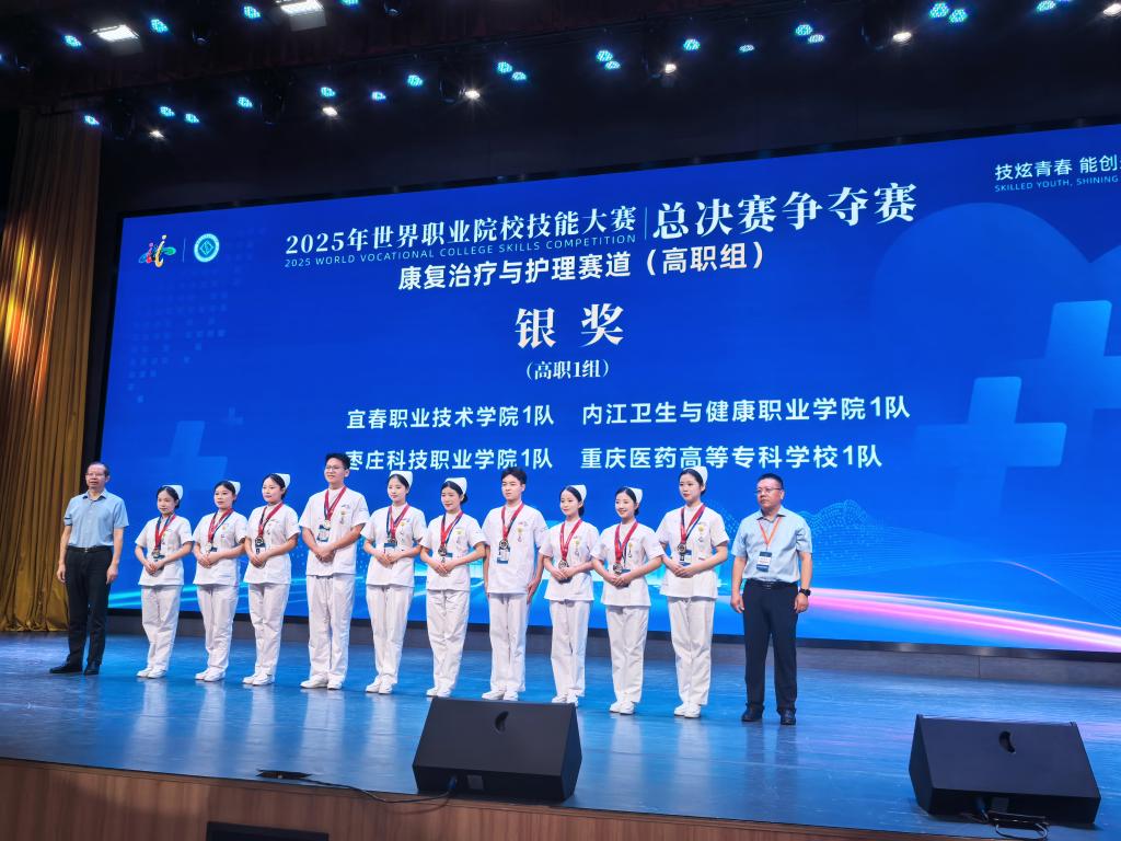 本站讯(护理学院刘世兰)8月30日上午,2025世界职业院校技能大赛总决赛康复治疗与护理赛道(高职组)争夺赛在苏州卫生职业技术学院顺利落幕。本次比赛共汇聚来自全国94支优秀队伍参赛,由我校护理学院院长易国萍领队,刘世兰、陈曼莉、李悠梦三位教师指导,学生陈朝玲、沈嘉婷、黄时三位选手以及刘磊(标准化病人)、张小倩(标准化病人家属)组成的参赛团队凭借出色的专业技能和默契的团队配合,最终在众多参赛队伍中脱颖而出,斩获银奖。