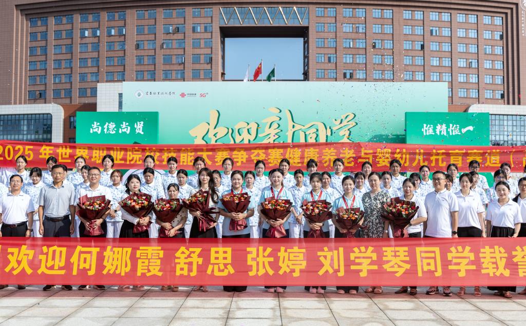 9月3日上午,党委副书记、校长李铁刚,党委委员、副校长刘叶建及有关部门负责人、以及护理学院师生代表在开物广场举办庆祝仪式,热烈庆祝世界职业院校技能大赛总决赛争夺赛高职组健康养老照护与婴幼儿托育赛道金奖团队的凯旋归来。