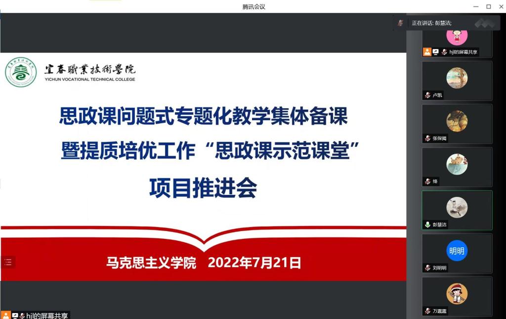 本站讯(马克思主义学院 宋彩虹)为贯彻落实中共江西省委教育工委、江西省教育厅《关于进一步推进“问题式专题化团队教学改革”工作方案》要求,进一步加强思政课教师队伍建设,深入推进我校思政课教学改革与创新,也为了更好地推进提质培优相关工作,7月21日上午,马克思主义学院通过腾讯会议召开问题式专题化团队教学集体备课会暨提质培优项目推进会。会议由马克思主义学院思想道德与法治教研室主任胡金兰主持。